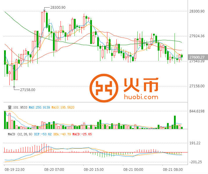 小幅上涨至高点28300.90,震荡交投于27000支撑上方。本交易日亚盘维持区间震荡,放量测试阻力,依旧持于27000上方。