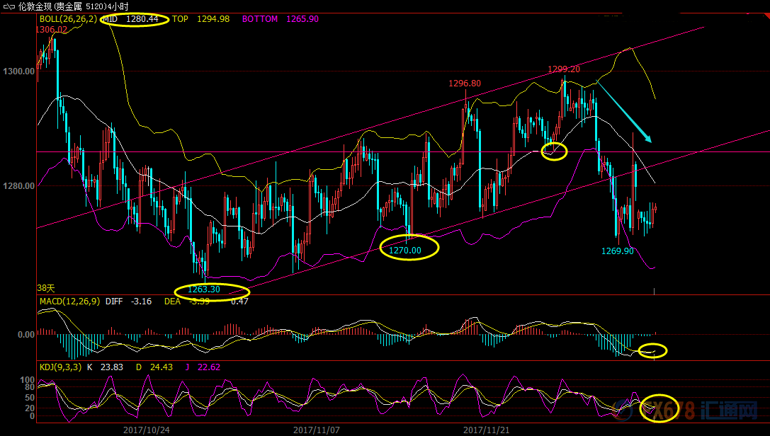 (现货黄金日线小时来看,布林线通道向下运行,短线附近的支撑,跌破则看向1263附近支撑;不过KDJ和MACD有结成金叉的迹象,短线存在反弹需求,关注布林线附近阻力,如果反弹受阻,金价或将延续跌势;不过如果金价能够顶破该阻力,则金价有可能进一步上探1286附近阻力,目前这一概率相对较低。